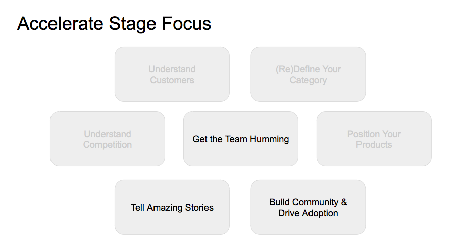 Finally, accelerating companies often have category and positioning more worked-out and get to prioritize the fun work of dominating a market by telling terrific product and customer stories to an engaged community that loves your product. This is still positioning, messaging, and storytelling, but to a different purpose.